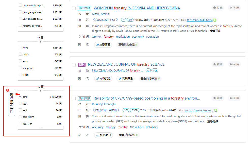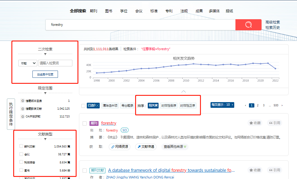 在經(jīng)綸的首頁可快速搜素5億級文獻(xiàn)數(shù)據(jù)的資源檢索,搜索關(guān)鍵詞“forestry”,有111萬余篇文獻(xiàn),在左側(cè)可進(jìn)行二次篩選:舉例:選擇“學(xué)位論文”--點(diǎn)擊“執(zhí)行限定條件”,排序上可以選擇“相關(guān)度、最新、正序”