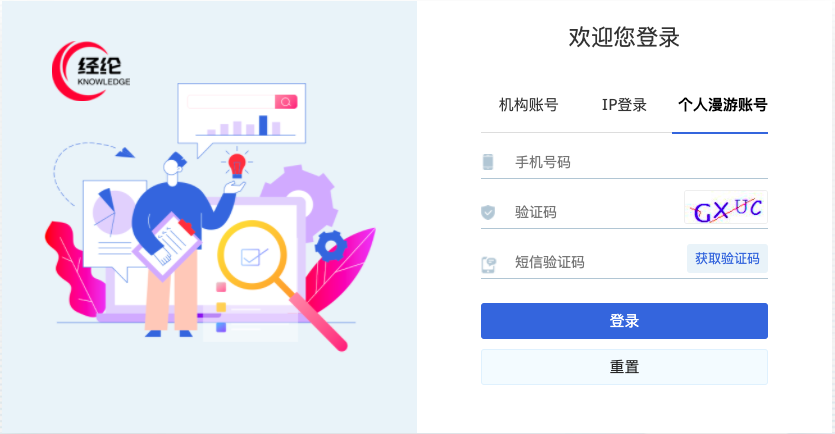 個(gè)人登錄注冊,需在學(xué)校IP范圍內(nèi),選擇“個(gè)人漫游賬號”,通過手機(jī)號注冊,即可在學(xué)校IP范圍外訪問。