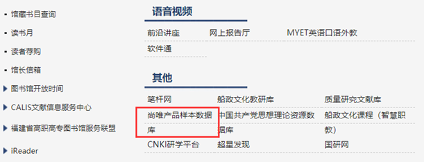 3、圖書館首頁(yè) - > 其他 - > 尚唯產(chǎn)品樣本數(shù)據(jù)庫(kù),找到數(shù)據(jù)庫(kù)。