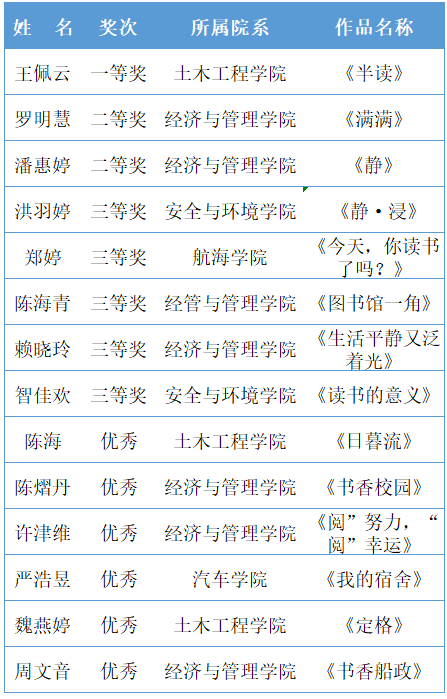 經(jīng)過一個多月的作品征集及評選,我館共收到來自九個學院幾百篇優(yōu)秀的攝影作品,經(jīng)過評比有14名同學進入終評,最終評選出一等獎1名,二等獎2名,三等獎5名,優(yōu)秀獎6名。讓我們一起來看看,是哪些獲獎者吧~