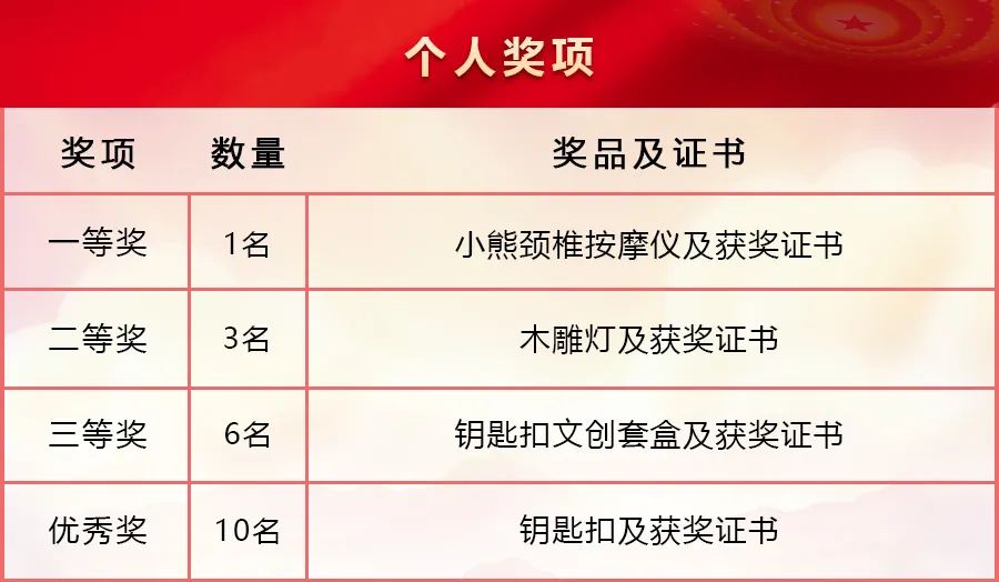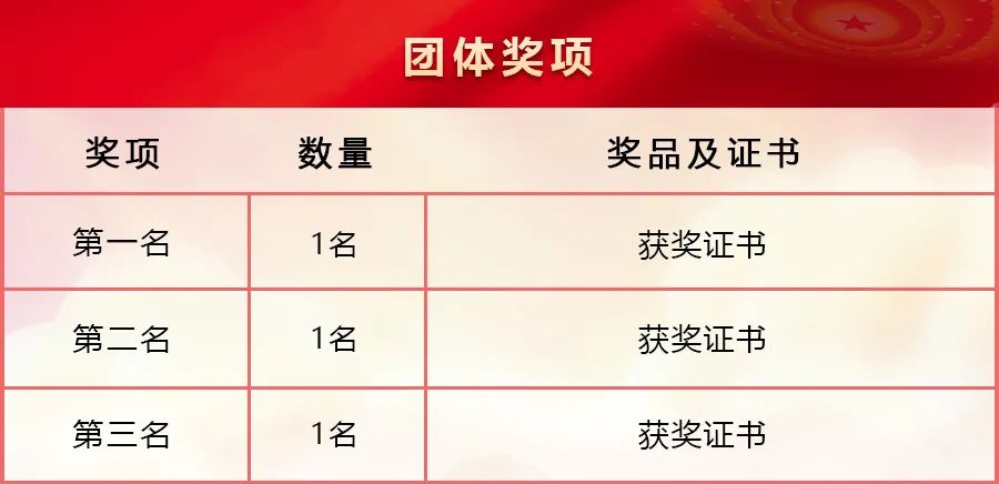 (4)團(tuán)體評獎以支部為單位,按支部全體黨員(含未參賽黨員)的人均成績進(jìn)行排名,評選出團(tuán)體第一名、第二名、第三名。