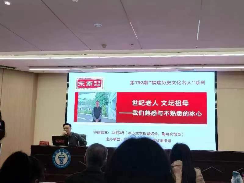 同時(shí),圖學(xué)聯(lián)志愿者們還觀摩了福建省圖書館“東南周末講壇”開設(shè)的冰心專題講座,應(yīng)邀了冰心文學(xué)館副館長邱偉壇到現(xiàn)場為大家作《世紀(jì)老人 文壇祖母——我們熟悉與不熟悉的冰心》的專題講座,吸引了百余名聽眾。