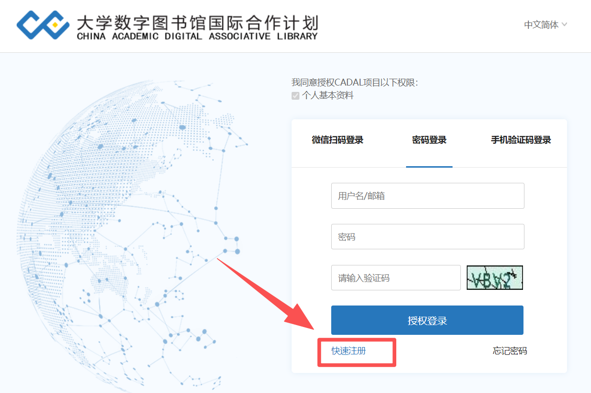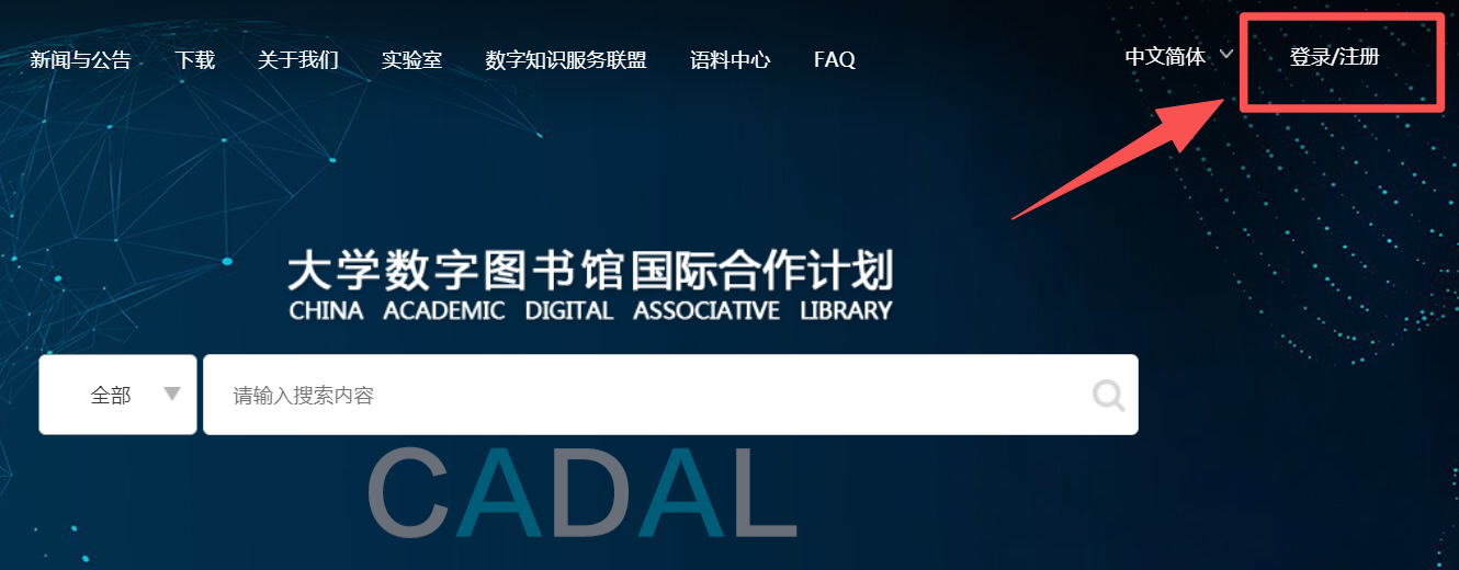 訪問CADAL官網(wǎng)(搜索:大學數(shù)字圖書館國際合作計劃),點擊右上角“登錄/注冊”即可打開登錄頁面。