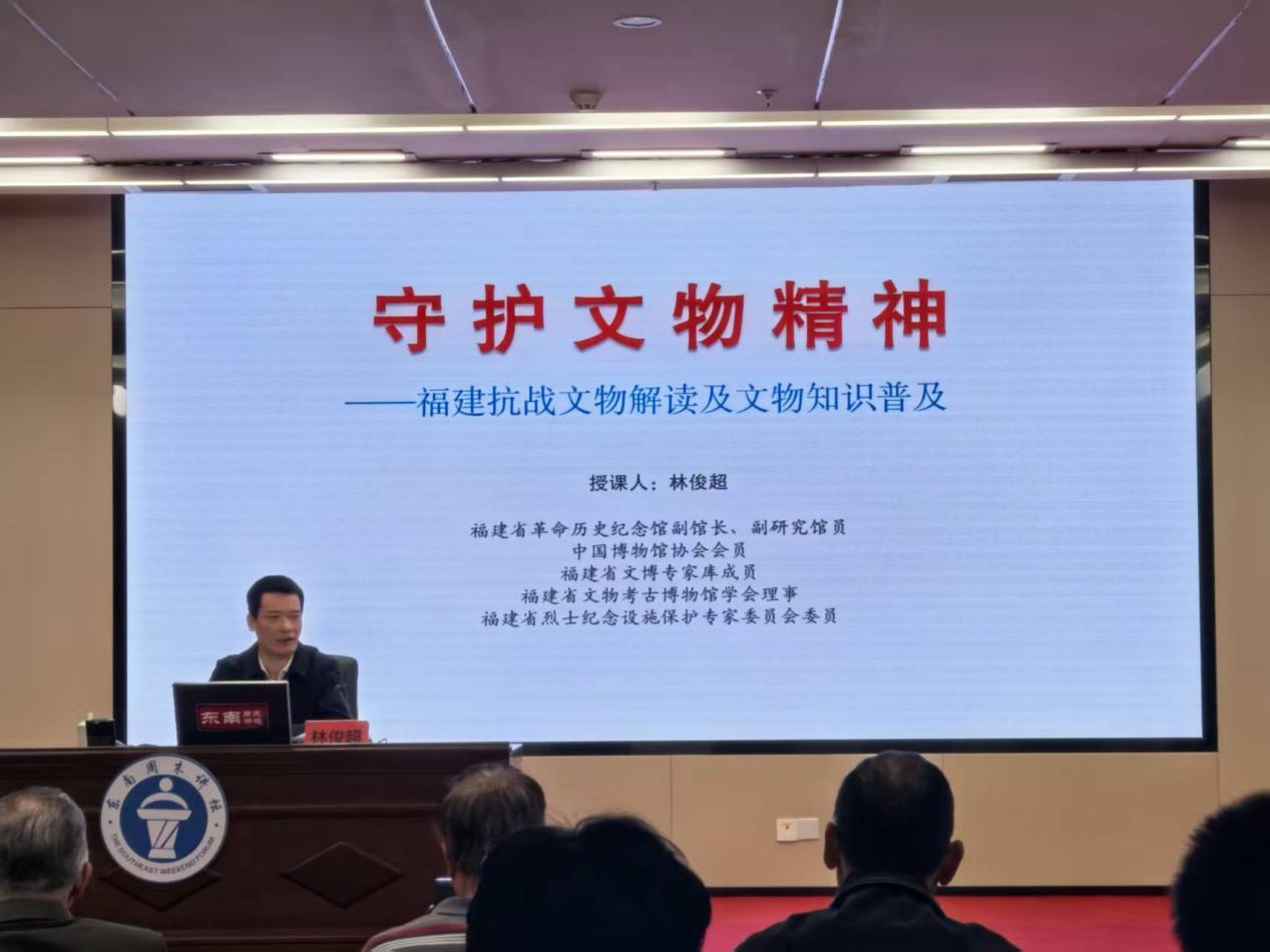隨后齊聚講座會(huì)場(chǎng),聆聽了由福建省革命歷史紀(jì)念館林俊超副館長(zhǎng)主講的《守護(hù)文物‘精神’——福建抗戰(zhàn)文物解讀及文物知識(shí)普及》專題講座。林館長(zhǎng)以豐富的文物實(shí)例,包括楊成武將軍使用過的望遠(yuǎn)鏡等珍貴抗戰(zhàn)文物,深入淺出地解讀了福建抗戰(zhàn)歷史,講述了文物背后蘊(yùn)含的抗戰(zhàn)精神和民族氣節(jié)。通過專業(yè)生動(dòng)的講解,志愿者們對(duì)福建抗戰(zhàn)歷史有了更深刻的認(rèn)識(shí),進(jìn)一步樹立了保護(hù)抗戰(zhàn)文物的意識(shí)。