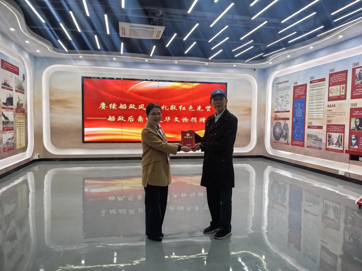 講座結束后,葉延華向學校無償捐贈6件珍貴的葉可鈺遺物,包括海軍制服配件、黨費證及工作筆記等,陳艷紅代表學院接受捐贈,并向葉延華先生致以由衷敬意與誠摯感謝。隨后,陳艷紅為葉延華頒授捐贈證書,雙方共同為展覽剪彩,正式拉開“紅色船政人”系列展覽的序幕。