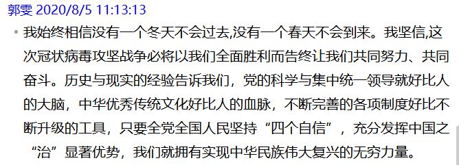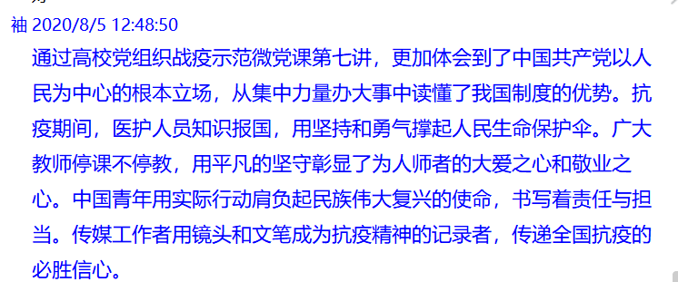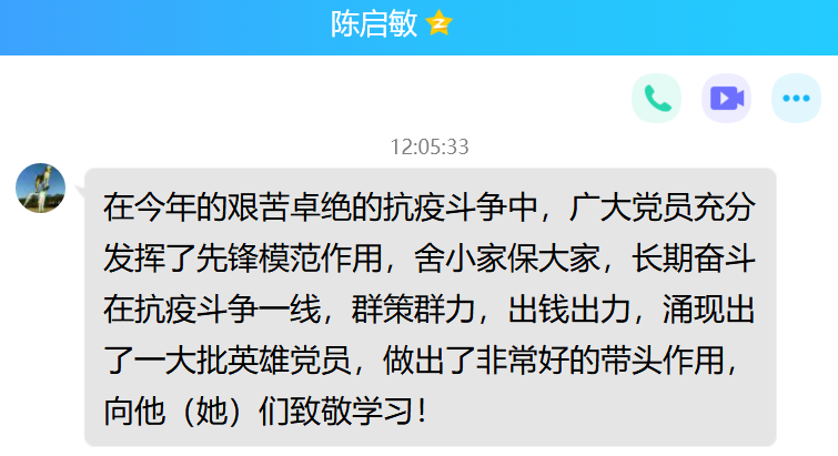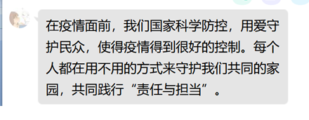 在一個(gè)多小時(shí)的微黨課中,10位主講人用鮮活的事例、權(quán)威的數(shù)據(jù)向我們展示了高校黨組織和廣大師生黨員堅(jiān)定人民至上理念,在疫情防控斗爭中踐行初心使命的優(yōu)秀事跡。這些先進(jìn)事跡深刻詮釋了中國共產(chǎn)黨人“不忘初心、牢記使命”的執(zhí)著堅(jiān)守,要牢牢把握立德樹人根本任務(wù),做好常態(tài)化疫情防控工作。
