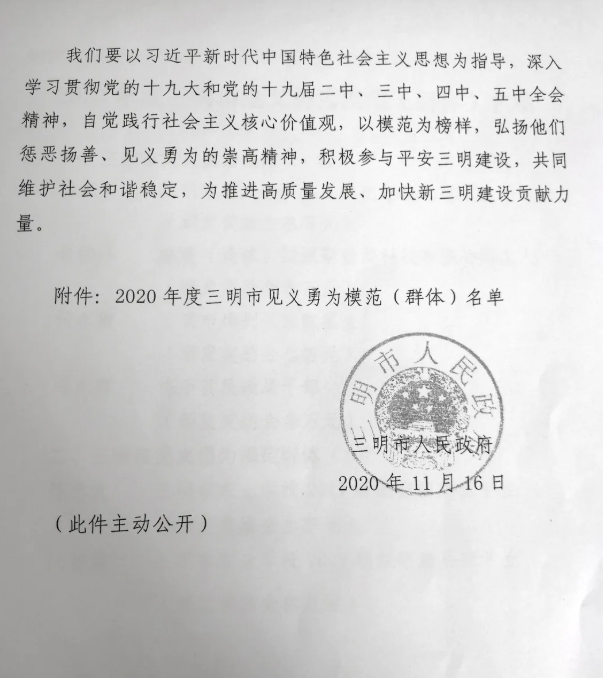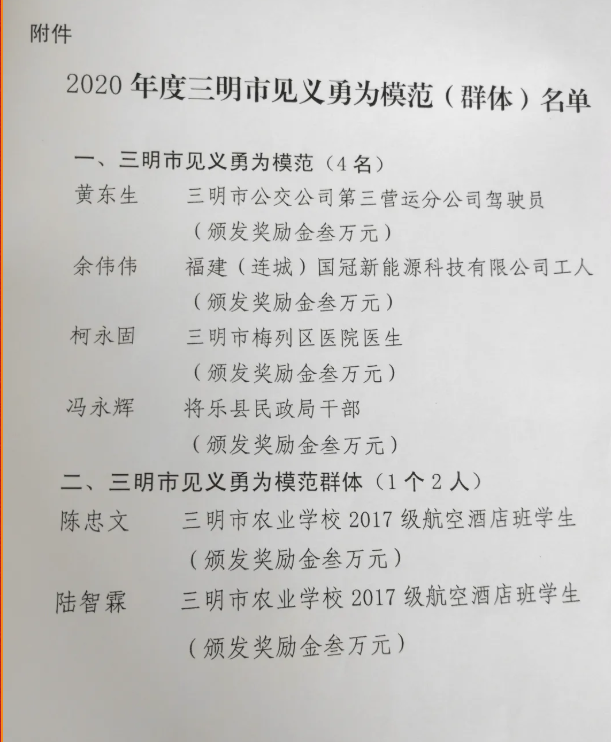 陳忠文和陸智霖勇制歹徒的英勇行為受到當?shù)刭潛P,陳忠文和陸智霖同學被評為“2020年度三明市見義勇為模范群體”。他們受邀參加了2019-2020年度見義勇為表彰大會,《三明農(nóng)校青年之聲》對他們的事跡進行了報道。
