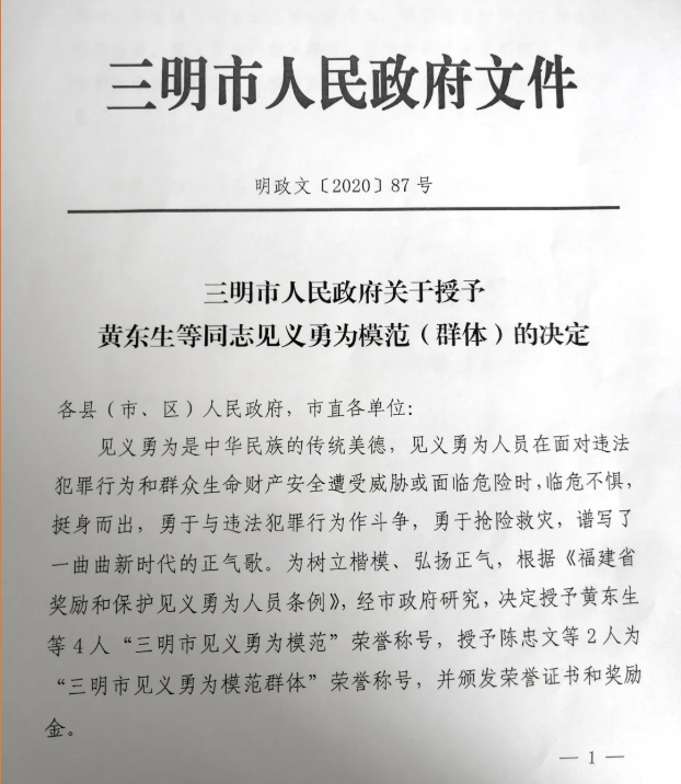 2019年10月11日,沙縣某山莊發(fā)生傷人事件,陳忠文和陸智霖不顧個人安危,全力搜尋并阻止企圖逃跑的歹徒,陳忠文腹部被打傷,陸智霖手臂被劃破,用盡力氣共制歹徒,直至警車到達現(xiàn)場。危急關(guān)頭,他們挺身而出,面對窮兇極惡的歹徒,他們不懼危險,用沉著冷靜和堅毅勇敢詮釋了什么是英勇無畏,他們用實際行動保護了人民群眾的安全,弘揚社會正能量。