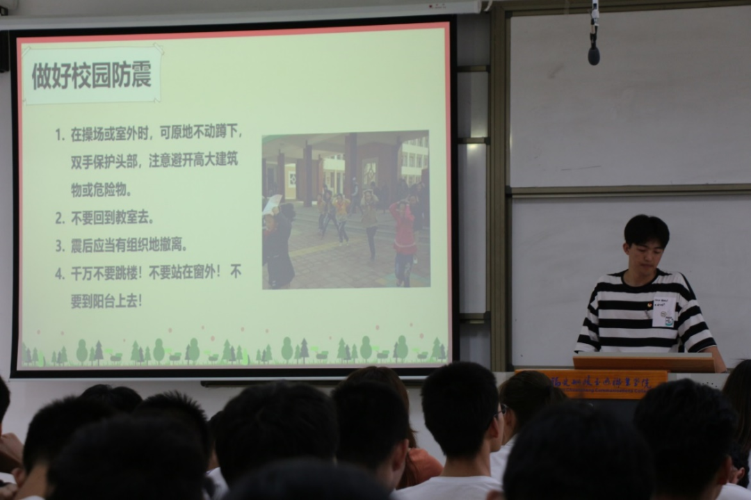 14時10分,自律會負責人翁杰宇為同學們開展防震減災主題講座,給同學們介紹了防震安全常識、地震的形成、地震時如何應對及正確的逃生路線等相關知識。