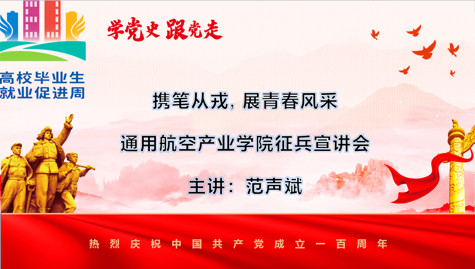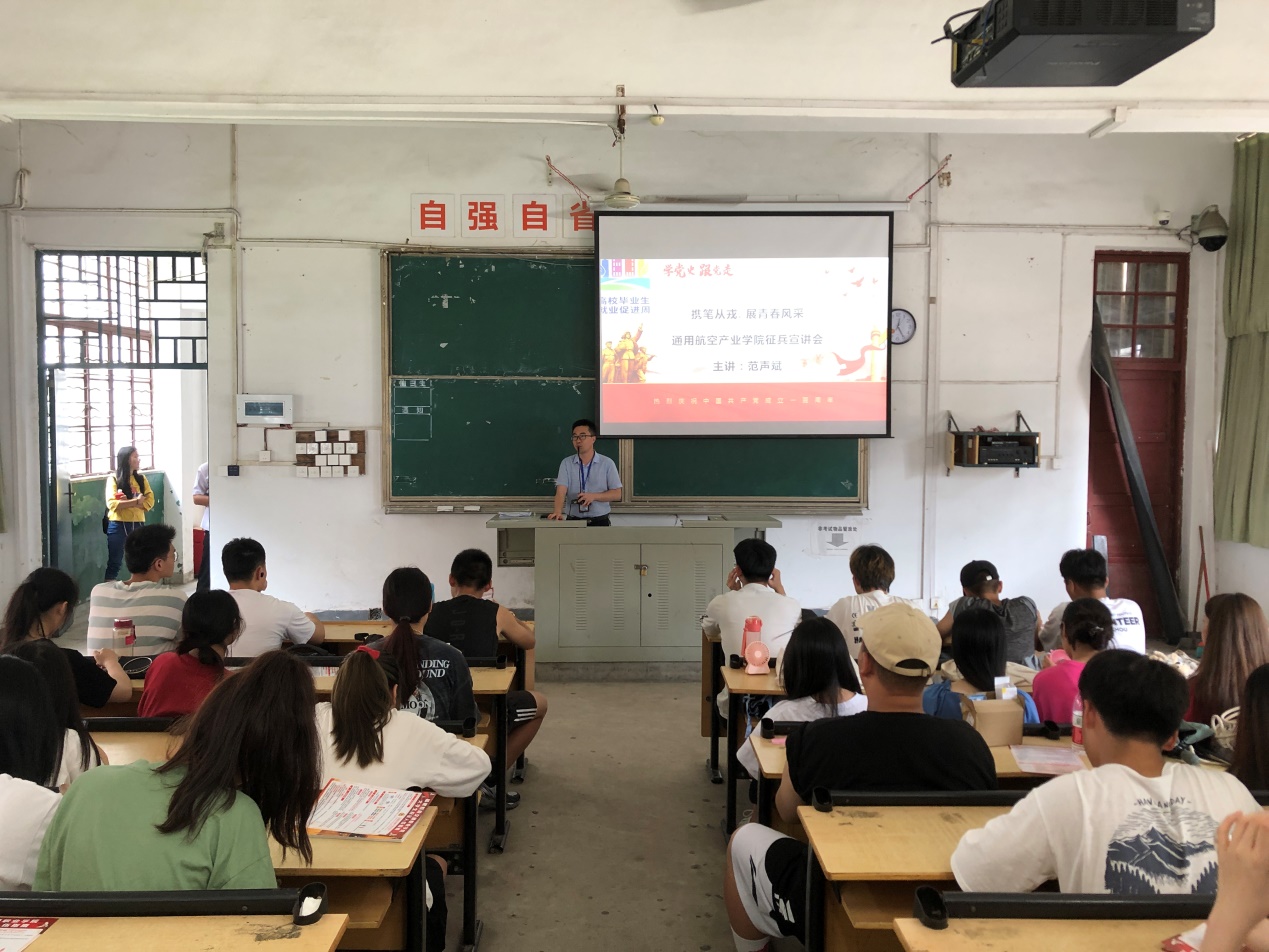 為進一步做好2021年我院大學生征兵宣傳工作,鼓勵熱血男兒積極應征入伍,提升兵源征集質(zhì)量,推進國防和軍隊現(xiàn)代化建設,5月21日中午,通用航空產(chǎn)業(yè)學院在8號樓階梯一,組織召開了“攜筆從戎, 展青春風采”2021年征兵宣講會。各年級近200余名學生參加,宣講會由輔導員范聲斌主講。