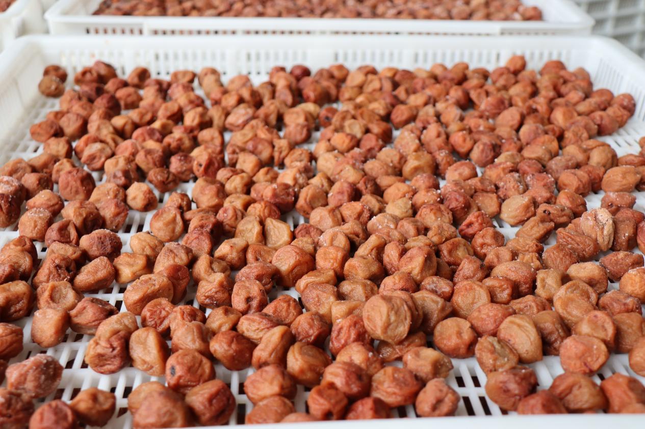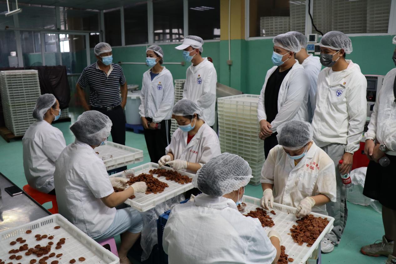 隊員們帶上口罩、防塵頭套,對手部、鞋底進行消毒殺菌處理,凈化衣服上的塵埃微生物。經(jīng)過一系列衛(wèi)生處理后隊員們進入了食品加工間。了解了青梅蜜餞的制作流程,從采摘、清洗、腌制、日曬、分級、去雜質(zhì)、去核、調(diào)味、過濾、糖漬到晾曬歷經(jīng)11道工序。