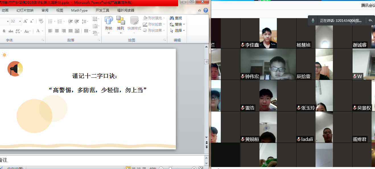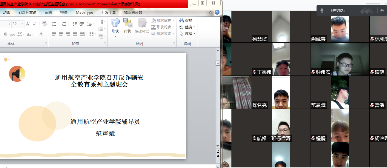 隨著社會的發(fā)展,信息技術(shù)的進(jìn)步,各種詐騙現(xiàn)象也成為社會日益突出的問題,為了讓同學(xué)們發(fā)現(xiàn)問題并及時解決,提高校園防范詐騙意識,降低校園詐騙的風(fēng)險(xiǎn),增強(qiáng)學(xué)生自我保護(hù)意識和避險(xiǎn)能力,保障學(xué)生安全。通用航空產(chǎn)業(yè)學(xué)院通過線上+線下召開防詐騙安全教育暨開學(xué)第一課主題班會,主題班會由輔導(dǎo)員范聲斌老師、輔導(dǎo)員陸李欽及各班主任主持。