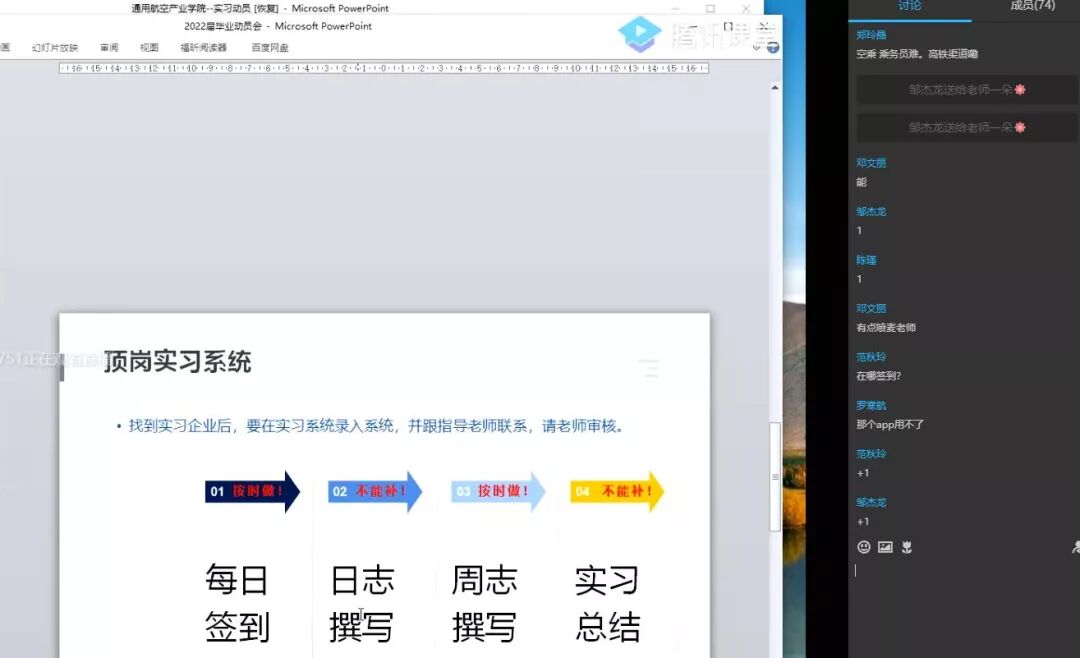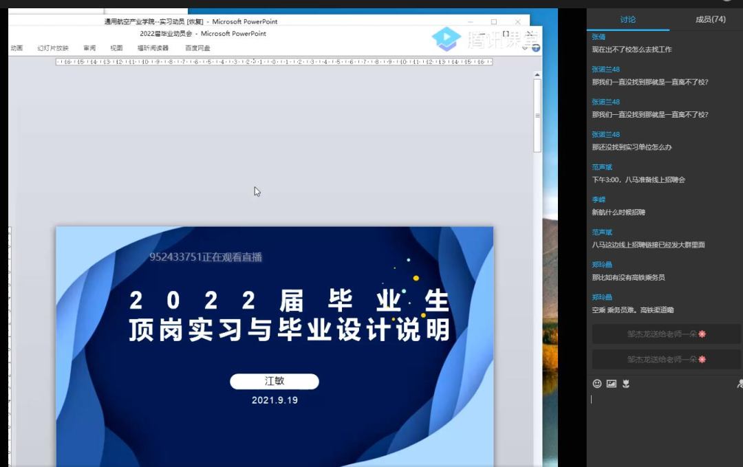 空乘教研室主任江敏老師就畢業(yè)生有關(guān)畢業(yè)設(shè)計(jì)報(bào)告要求進(jìn)行詳細(xì)簡(jiǎn)介。最后輔導(dǎo)員范聲斌老師強(qiáng)調(diào)疫情防控不能松懈,要求學(xué)生堅(jiān)持釘釘體溫打卡,在實(shí)習(xí)崗位中要嚴(yán)格遵守實(shí)習(xí)紀(jì)律和實(shí)習(xí)單位的各項(xiàng)規(guī)章制度,服從管理。