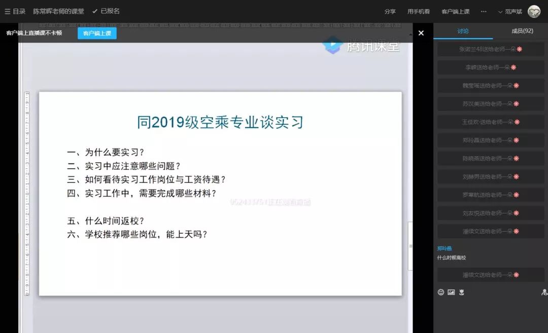 2019級(jí)空中乘務(wù)專業(yè)學(xué)生即將奔赴實(shí)習(xí)崗位,為進(jìn)一步加強(qiáng)2019級(jí)離校實(shí)習(xí)學(xué)生安全教育和管理工作,做好學(xué)生校外實(shí)習(xí)的疫情防控工作,充分保障學(xué)生實(shí)習(xí)期間的安全,強(qiáng)化學(xué)生遵紀(jì)守法觀念和安全防范意識(shí)。9月15日,通用航空產(chǎn)業(yè)學(xué)院依托騰訊平臺(tái),召開2019級(jí)學(xué)生實(shí)習(xí)動(dòng)員會(huì)暨安全教育主題班會(huì),主題班會(huì)由學(xué)院院長(zhǎng)陳常暉主持,學(xué)院黨總支副書記蘇漢美,空乘教研室主任江敏老師、輔導(dǎo)員范聲斌老師及我院88