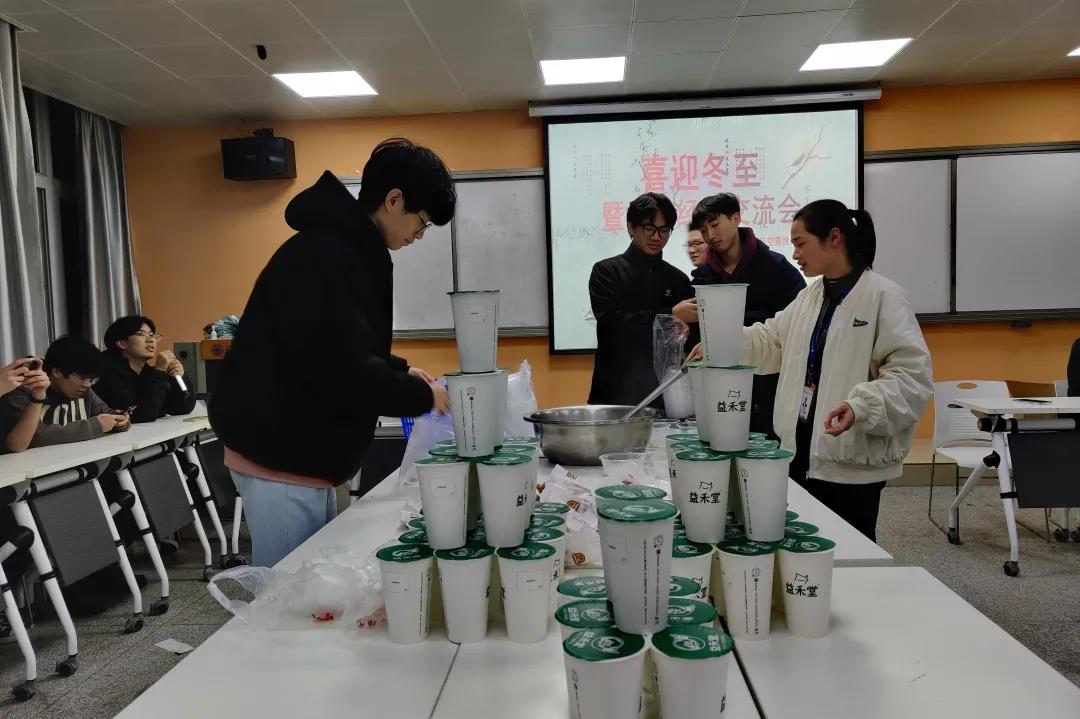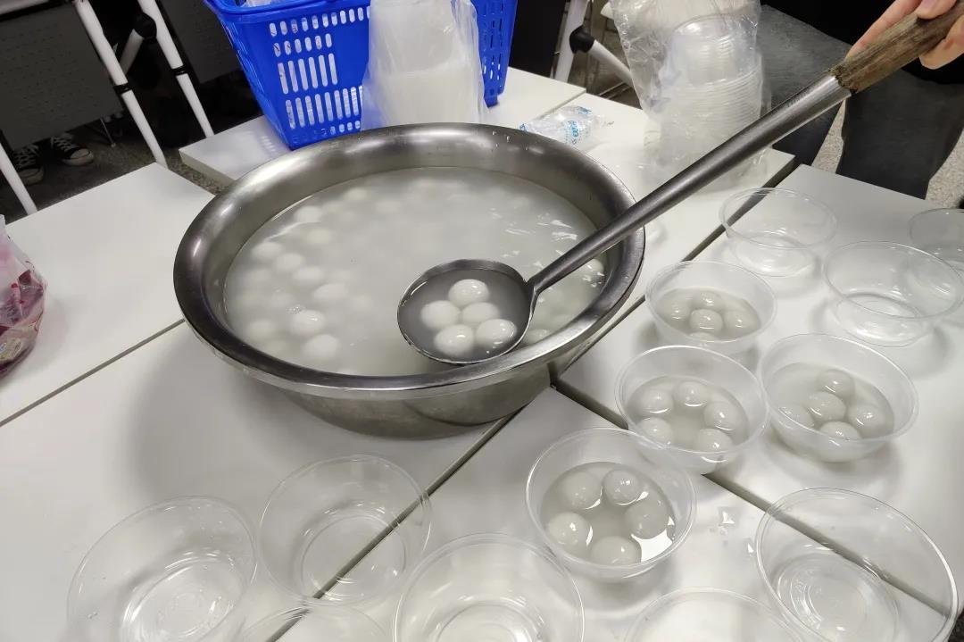 同學們一邊吃著熱氣騰騰的湯圓,一邊交流學習經(jīng)驗為即將到來的期末考做準備。
