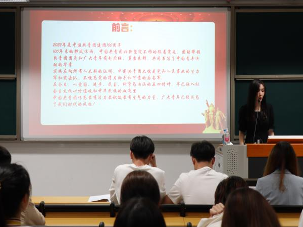 一段段鮮活的故事,一個個深刻的感悟,一次次打動著在場的每一個人,掌聲此起彼伏。選手們以激情澎湃,感人肺腑的演講,別具一格的視頻展示,給觀眾帶來聽覺、視覺的震撼。作為祖國的新一代接班人,我們胸懷強烈的歷史責任感、使命感?;厥装倌陥F史,我們的心緒就像大海的波濤,久久不能平靜,中國共產(chǎn)主義青年團在黨的帶領下,組織下,在中華文明歷史邏輯、現(xiàn)代化發(fā)展邏輯和共產(chǎn)主義運動邏輯的共同推動之下得以誕生和發(fā)展。我們要用馬克思列寧主義、毛澤東思想和現(xiàn)代科學文化武裝自己,做促進改革開放的模范,做遵守職業(yè)道德和社會公德的模范,做學習和維護社會主義民主、守法遵紀的模范,做維護民族團結,在兩個文明建設的實踐中,鍛煉成為有理想、有道德、有文化、有紀律的優(yōu)秀青年。青年人要有“敢教日月?lián)Q新天”的堅定信念,“千磨萬擊還堅勁”的強大意志和“亂云飛渡仍從容”的非凡定力,方能凝聚起實現(xiàn)中華民族偉大復興中國夢的磅礴偉力?!耙郧啻褐?,創(chuàng)建青春之家庭,青春之國家,青春之民族。”27歲時李大釗寫下的誓言,仍是吾輩所求。實現(xiàn)第二個百年奮斗目標新的趕考之路,青年人定能寫下不負黨和人民的精彩答卷。
