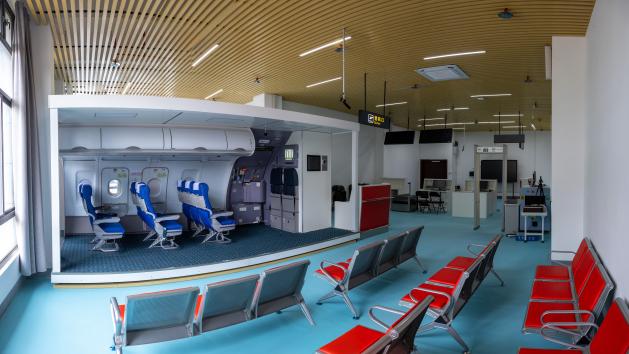 “空中乘務”實訓中心,按照民航總局四級乘務員教學培訓標準,建設有模擬客艙、撤離平臺、機場地面服務、形體訓練室等。