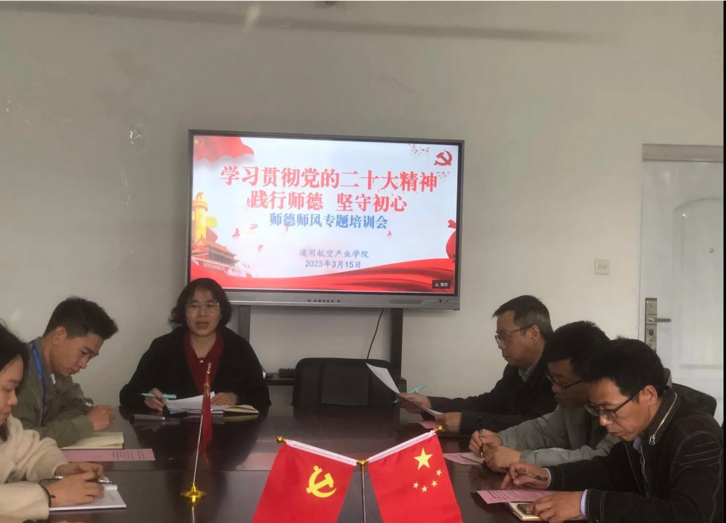 為進一步貫徹黨的教育方針,推動學(xué)院師德師風(fēng)建設(shè)活動深入開展,3月15日下午,通用航空產(chǎn)業(yè)學(xué)院在鑒知樓1213黨員活動室開展“學(xué)習(xí)貫徹黨的二十大 踐行師德 堅守初心”師德師風(fēng)專題培訓(xùn)會。學(xué)院全體教師參加了會議,會議由黨總支副書記蘇漢美主持。
