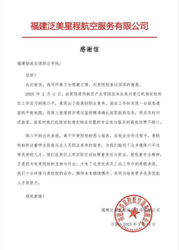 近日,福建船政交通職業(yè)學(xué)院通用航空航空產(chǎn)業(yè)學(xué)院收到福建泛美星程航空服務(wù)有限公司的感謝信,高度贊揚(yáng)我院實(shí)習(xí)生陳川平在泉州晉江機(jī)場安檢崗位的突出表現(xiàn)。信中提及,陳川平在執(zhí)勤時(shí)發(fā)現(xiàn)旅客遺失的平板電腦后,迅速通過監(jiān)控鎖定失主并高效歸還,其專業(yè)素養(yǎng)與責(zé)任意識獲得企業(yè)及旅客一致認(rèn)可。企業(yè)充分肯定我院“產(chǎn)教融合、德技并修”的育人理念,認(rèn)為此類優(yōu)秀案例是校企協(xié)同育人成果的直接體現(xiàn)。