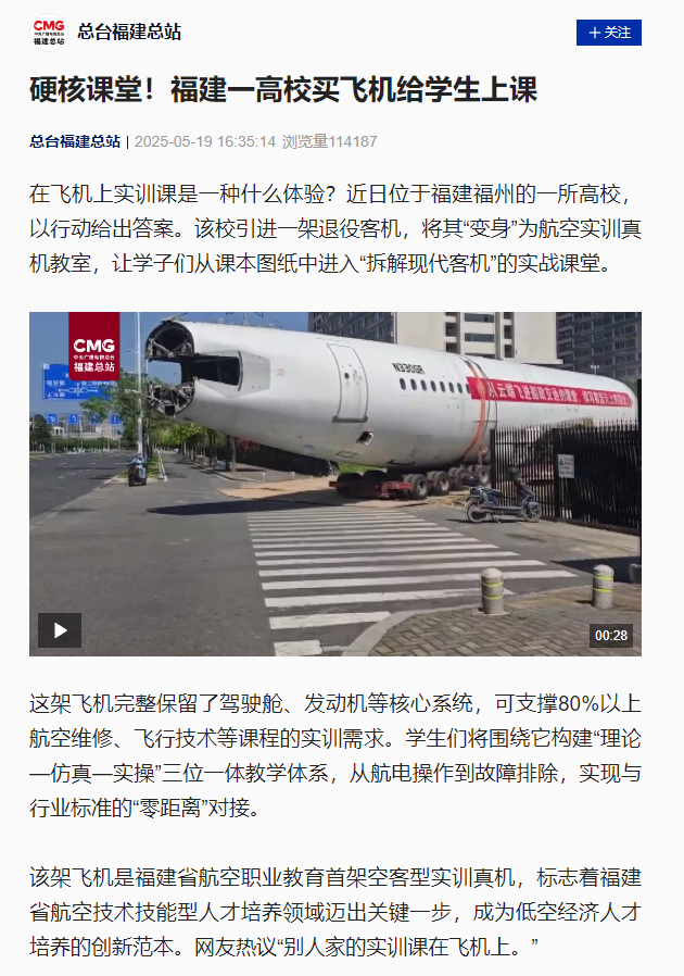 該架飛機是福建省航空職業(yè)教育首架空客型實訓真機,標志著福建省航空技術技能型人才培養(yǎng)領域邁出關鍵一步,成為低空經(jīng)濟人才培養(yǎng)的創(chuàng)新范本。網(wǎng)友熱議“別人家的實訓課在飛機上?!?/span>