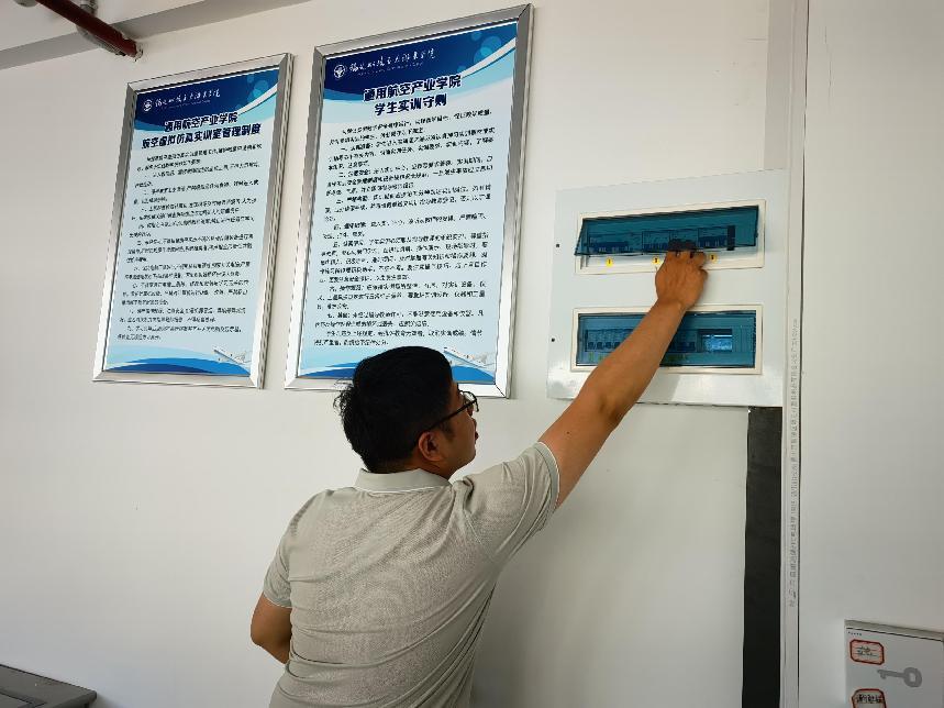 為做好假期實(shí)驗(yàn)室安全管理工作,排查實(shí)驗(yàn)室安全隱患,防范安全事故,筑牢學(xué)院實(shí)驗(yàn)室安全防線。7月1日下午,我院實(shí)訓(xùn)中心老師對(duì)學(xué)院在藝新樓內(nèi)的8間實(shí)訓(xùn)室,一樓走廊的空乘模擬艙、撤離平臺(tái)和在停機(jī)坪的A320大飛機(jī)、直升機(jī)等場(chǎng)地和設(shè)備開(kāi)展安全檢查。