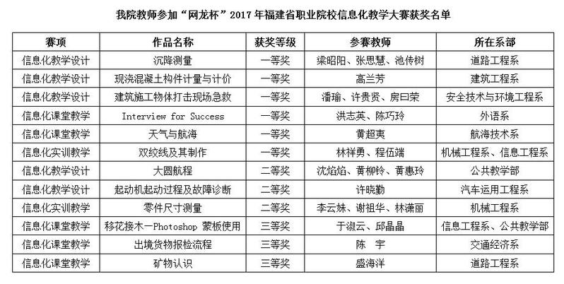 日前,從“網(wǎng)龍杯”2017年福建省職業(yè)院校信息化教學大賽上傳來喜訊,經(jīng)網(wǎng)絡初評和現(xiàn)場決賽,我院參賽教師取得一等獎作品6件、二等獎作品3件、三等獎作品3件的優(yōu)異成績,一等獎作品獲獎數(shù)和參賽作品獲獎總成績均位居全省高職院校首位。