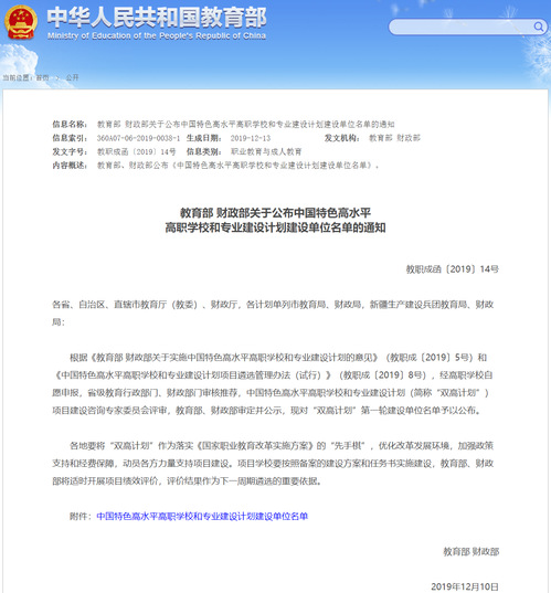 今年4月,教育部、財政部發(fā)布《關(guān)于實施中國特色高水平高職學(xué)校和專業(yè)建設(shè)計劃的意見》,提出將實施中國特色高水平高職學(xué)校和專業(yè)建設(shè)計劃(簡稱“雙高計劃”),集中力量建設(shè)50所左右高水平高職學(xué)校和150個左右高水平專業(yè)群。