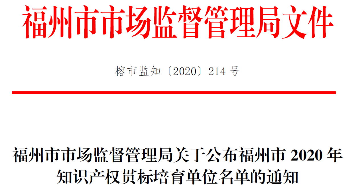 根據(jù)國(guó)家、省、市相關(guān)疫情期間支持復(fù)工復(fù)產(chǎn)文件通知要求和《福州市自主知識(shí)產(chǎn)權(quán)資助和獎(jiǎng)勵(lì)辦法》(榕政綜[2018]210號(hào))精神,經(jīng)申請(qǐng),福州市知識(shí)產(chǎn)權(quán)局、市場(chǎng)監(jiān)管局推薦,我校被確定福州市2020 年知識(shí)產(chǎn)權(quán)貫標(biāo)培育單位。