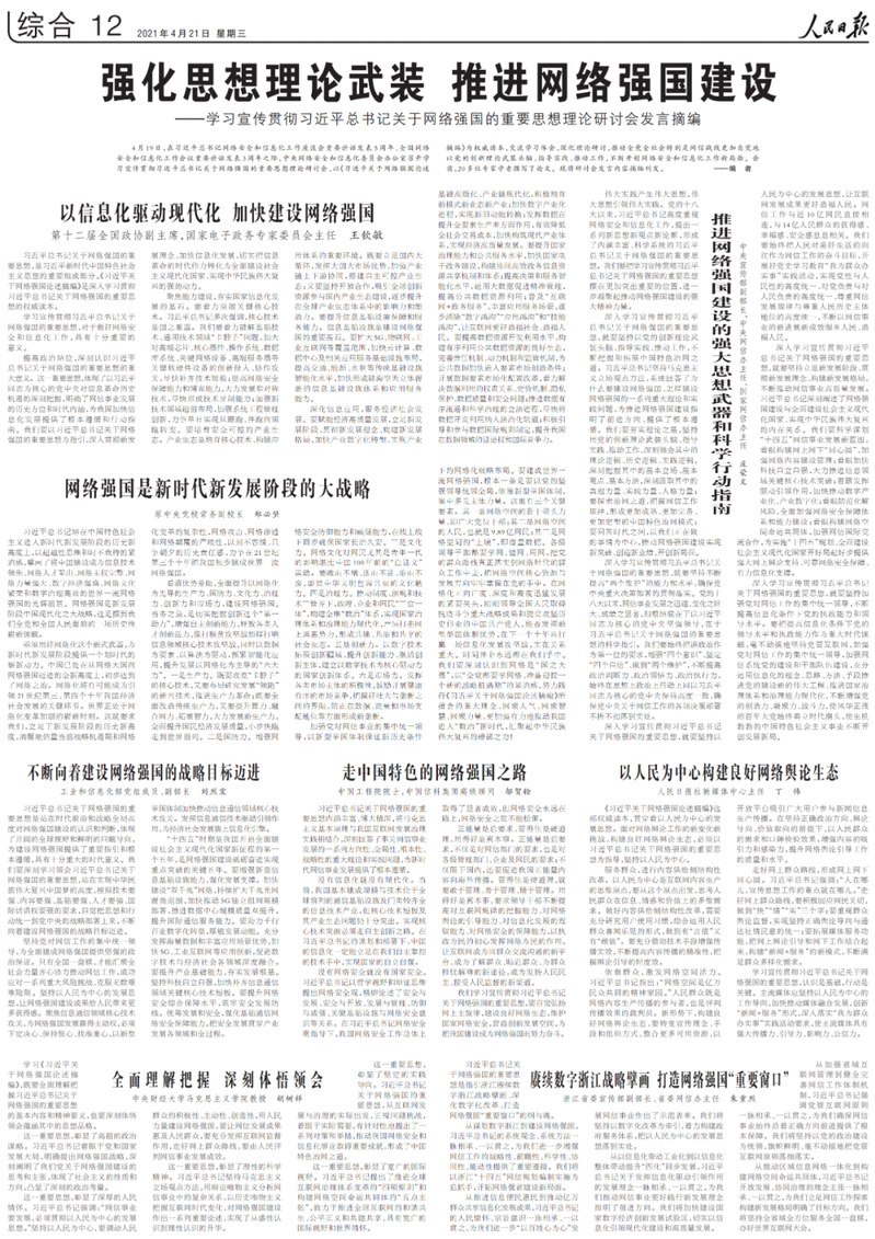 4月19日,在習近平總書記網(wǎng)絡安全和信息化工作座談會重要講話發(fā)表5周年、全國網(wǎng)絡安全和信息化工作會議重要講話發(fā)表3周年之際,中央網(wǎng)絡安全和信息化委員會辦公室召開學習宣傳貫徹習近平總書記關于網(wǎng)絡強國的重要思想理論研討會,以《習近平關于網(wǎng)絡強國論述摘編》為權威讀本,交流學習體會,深化理論研討,推動全黨全社會特別是網(wǎng)信戰(zhàn)線更加自覺地以黨的創(chuàng)新理論武裝頭腦、指導實踐、推動工作,不斷開創(chuàng)網(wǎng)絡安全和信息化工作新局面。會前,20多位專家學者撰寫了論文。4月21日出版的人民日報專版摘編刊發(fā)理論研討會發(fā)言內(nèi)容。