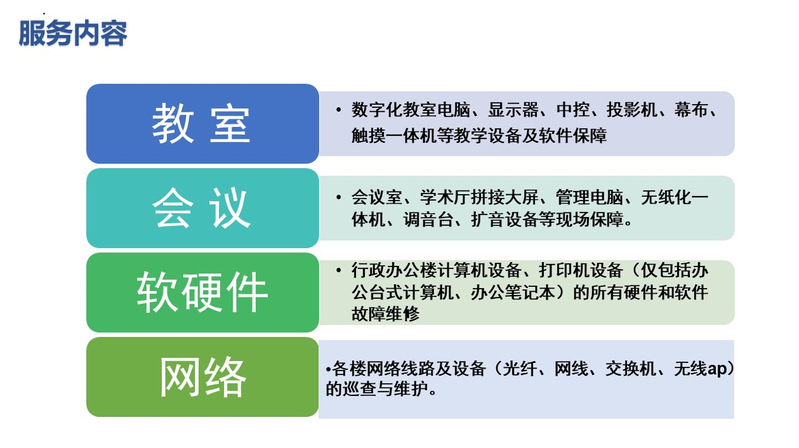 目前學(xué)校形成了以未來課堂、智慧教室、在線教學(xué)平臺、教室“有線+無線”專網(wǎng)為核心的全生態(tài)課堂教學(xué)環(huán)境,信息化建設(shè)從“數(shù)字化校園”階段邁進(jìn)“智慧校園”階段。數(shù)字化校園環(huán)境,給師生的學(xué)習(xí)工作帶來巨大的便利,但是教室、會議室設(shè)備不斷更新,設(shè)備越來越復(fù)雜、越來越專業(yè),對于日常維護(hù)工作帶來很大的困難。針對教學(xué)工作中師生用戶反映校園數(shù)字化設(shè)備利用率不高,多媒體設(shè)備維護(hù)保障滯后,會議室技術(shù)支持能力不足等實(shí)際問題,學(xué)校數(shù)據(jù)中心按照公開招標(biāo)等程序,2021年9月組建一支數(shù)字化教室及信息化設(shè)備維保專業(yè)服務(wù)團(tuán)隊(duì)。團(tuán)隊(duì)由7名工程師組成。服務(wù)內(nèi)容包括全院180間數(shù)字化教室,以及5間會議室、1間學(xué)術(shù)報告廳、1間教學(xué)管理中心、1間虛擬演播室、行政辦公樓的電腦及學(xué)院各教學(xué)辦公樓網(wǎng)絡(luò)巡查與維護(hù)等。團(tuán)隊(duì)通過構(gòu)建嚴(yán)格的服務(wù)考核機(jī)制,建立可量化的任務(wù)和目標(biāo),結(jié)合每周每月日常任務(wù)、年度重點(diǎn)工作任務(wù)、提高服務(wù)質(zhì)量。