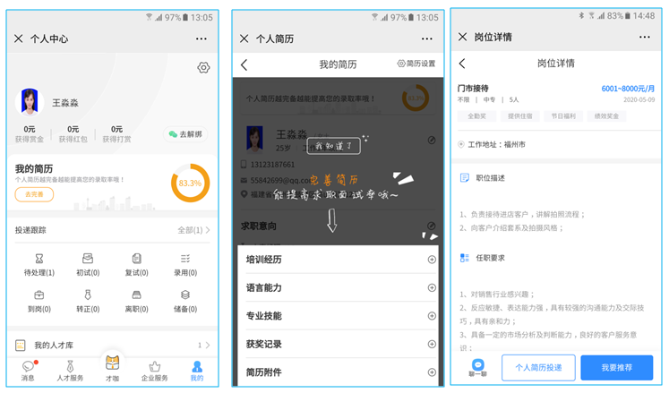 點(diǎn)“我的簡(jiǎn)歷”→填寫(xiě)具體信息→進(jìn)行在線個(gè)人簡(jiǎn)歷投遞