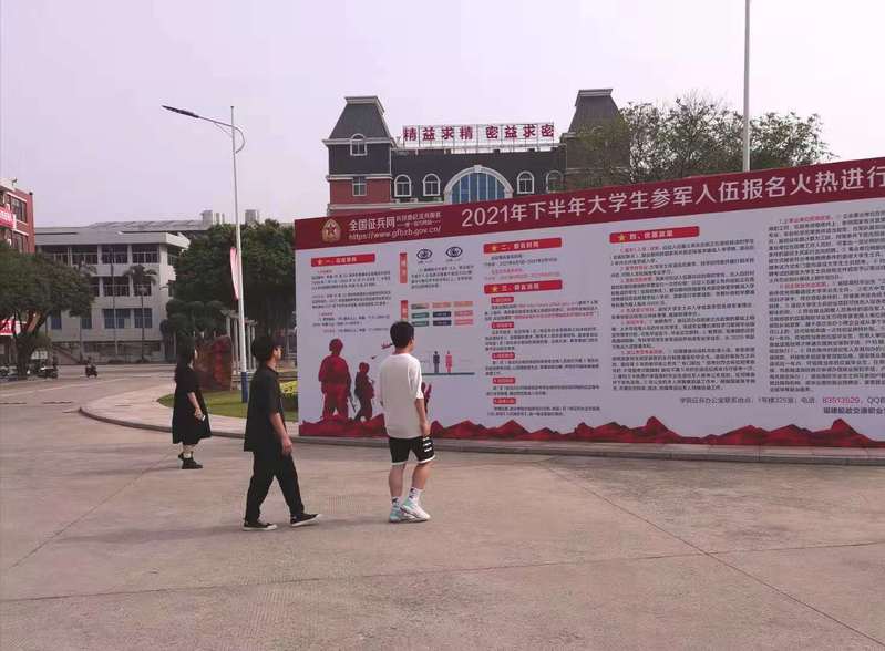 在校園主干道擺放巨幅宣傳牌,公布本次征兵主要政策、報(bào)名流程等,用激情四射的圖文號(hào)召大家“畢業(yè)了,當(dāng)兵去!”同樣的內(nèi)容制作成宣傳冊(cè),通過(guò)微信公眾號(hào)、班級(jí)微信群、QQ群等多種形式、渠道傳遞給同學(xué)們。征兵工作站開通熱線電話,隨時(shí)接受咨詢。