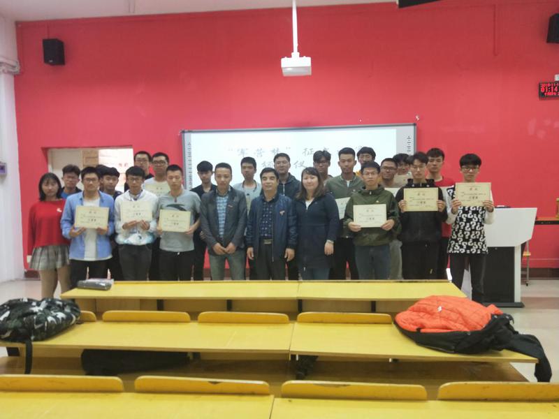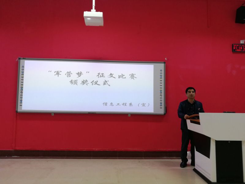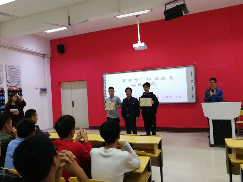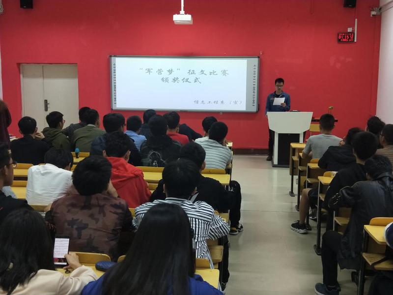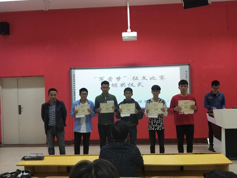 為弘揚(yáng)愛國主義精神,營造愛國熱情的學(xué)院風(fēng)范。2018年11月14日下午13:00在船政北區(qū)2#1-5舉行了“軍營夢”征文比賽頒獎(jiǎng)儀式。信息系系書記孫基老師、征兵負(fù)責(zé)人唐曉軍老師以及“軍營夢”征文比賽負(fù)責(zé)人2017級輔導(dǎo)員黃華梅老師。本次頒獎(jiǎng)儀式由2017級電信班唐宋杰主持。