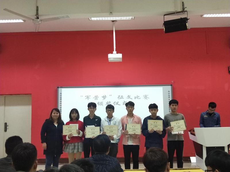 頒獎(jiǎng)儀式開始,主持人介紹了“軍營夢”征文比賽的得獎(jiǎng)情況和評選活動(dòng)情況,并向現(xiàn)場參加頒獎(jiǎng)儀式的同學(xué)介紹了到場老師。隨后信息系系書記孫基老師發(fā)言宣布并恭喜得獎(jiǎng)同學(xué),然后由信息系系書記孫基老師為獲得一等獎(jiǎng)的同學(xué)頒獎(jiǎng)并發(fā)放獎(jiǎng)品及獎(jiǎng)狀,征兵負(fù)責(zé)人唐曉軍老師為獲得二等獎(jiǎng)的同學(xué)頒獎(jiǎng)并發(fā)放獎(jiǎng)品及獎(jiǎng)狀,“軍營夢”征文比賽負(fù)責(zé)人2017級輔導(dǎo)員黃華梅老師為獲得三等獎(jiǎng)的同學(xué)頒獎(jiǎng)并發(fā)放獎(jiǎng)品及獎(jiǎng)狀,頒發(fā)優(yōu)秀獎(jiǎng)。隨后一起合影留戀記錄這光榮的一刻。
