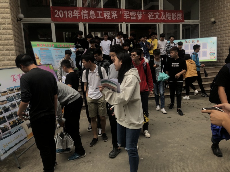 信息工程系于2018年11月12日至2018年11月14日在北區(qū)2#1樓舉辦了信息工程系“軍營夢”征文及攝影展,此活動旨在展現(xiàn)我校2018級新生軍訓(xùn)風(fēng)采。該活動通過攝影圖片展示的形式,力求從攝影的角度來表現(xiàn)新一屆船政學(xué)子的精神風(fēng)貌,并為所有愛好攝影藝術(shù)的船政師生搭建一座展示其攝影技巧,記錄發(fā)現(xiàn),表現(xiàn)創(chuàng)意的平臺。并且2017,2018級的船政學(xué)子以征文比賽的形式表達(dá)了對祖國的熱愛,并且與軍訓(xùn)照片一同展出。