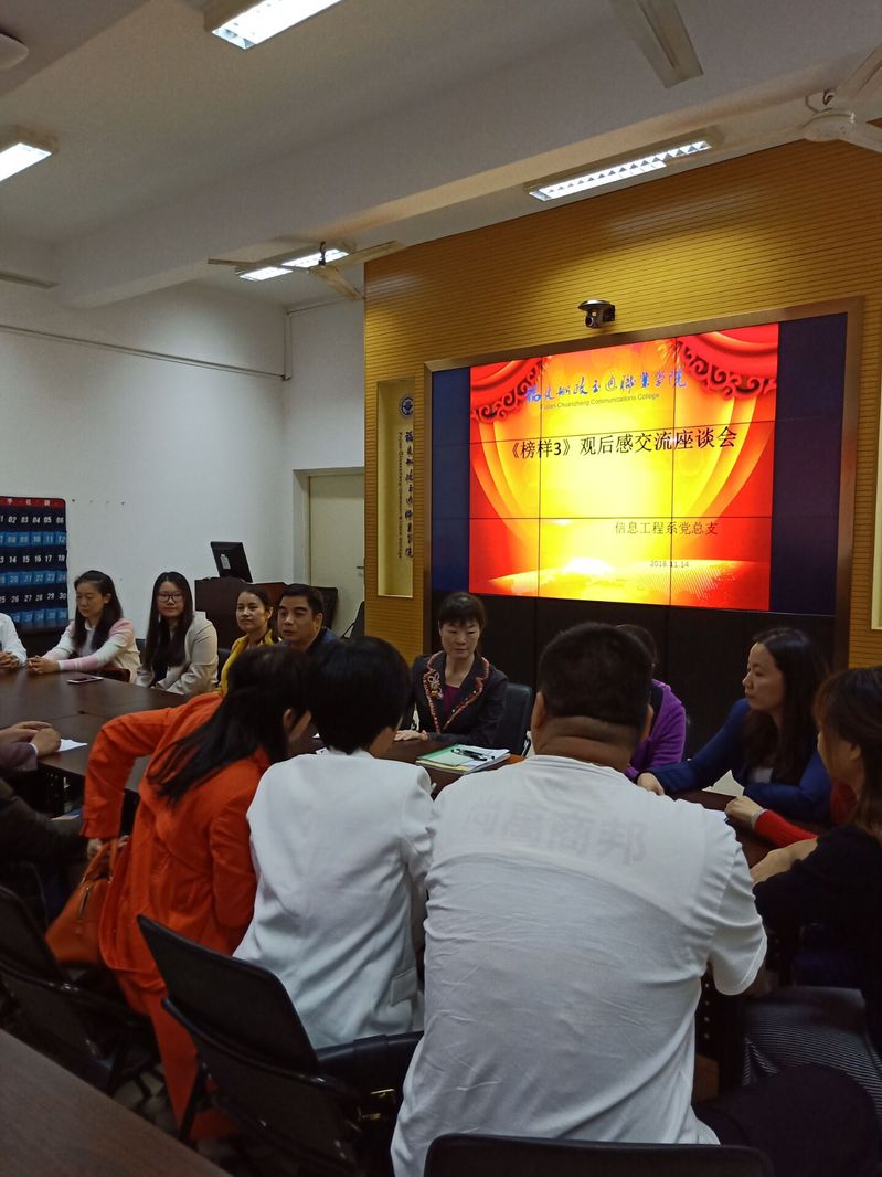 根據(jù)《中共中央組織部辦公廳關(guān)于認(rèn)真做好<榜樣3>專題節(jié)目學(xué)習(xí)宣傳工作的通知》(組廳字[2018]42號(hào))文件精神,以及福建船政交通職業(yè)學(xué)院黨委工作部的統(tǒng)一部署,信息工程系黨總支把組織學(xué)習(xí)專題節(jié)目《榜樣3》作為開(kāi)展“兩學(xué)一做”學(xué)習(xí)教育的一項(xiàng)重要內(nèi)容,于2018年11月14日集中全系黨員教職工在2-1遠(yuǎn)程教室集中觀看《榜樣3》,觀影結(jié)束后,開(kāi)展熱烈的座談交流,每位黨員依次發(fā)表了相關(guān)體會(huì),全體黨員圍繞“不忘初心、繼續(xù)前行”,結(jié)合各自工作實(shí)際,從看榜樣、學(xué)榜樣,以感動(dòng)變帶動(dòng)、化感動(dòng)為行動(dòng)的方面進(jìn)行了深入交流探討。