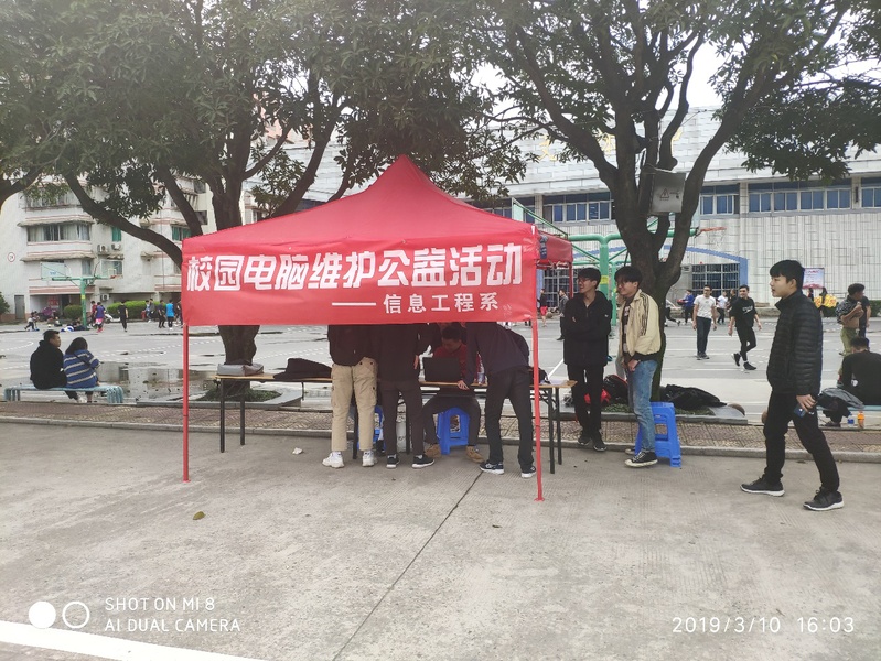 慶祝團的十八大,我系開展放下手機,走出宿舍,走向活動校園電腦義務(wù)維護公益活動。2019年3月10日上午,信息工程系的青年協(xié)會志愿者來到學(xué)校文化墻旁,開展本次活動,為同學(xué)及老師義務(wù)維修、維護計算機,同時還為同學(xué)講解了計算機日常使用和維護的知識。