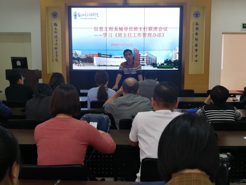 我系按照學(xué)院要求,于2019年11月11日中午12點(diǎn)30分,組織全體班主任在2號(hào)樓201室進(jìn)行學(xué)習(xí)。會(huì)議由信息工工程系黨總支孫基書記主持,在會(huì)上孫基書記帶領(lǐng)全體班主任認(rèn)真學(xué)習(xí)研讀了《福建船政交通職業(yè)學(xué)院班主任管理辦法》,他指出班主任是學(xué)校思想政治教育、學(xué)生管理工作的重要組成部分,是開展大學(xué)生思想政治教育的骨干力量,是學(xué)生健康成長(zhǎng)成才的引路人,強(qiáng)調(diào)所有班主任要協(xié)同輔導(dǎo)員一起做好思想引領(lǐng)、學(xué)業(yè)指導(dǎo)、大學(xué)生涯輔導(dǎo)和職業(yè)規(guī)劃等工作。他強(qiáng)調(diào)做好班主任工作的關(guān)鍵在于要有教書育人的情懷、要有對(duì)學(xué)生的熱愛。會(huì)上,孫基書記還對(duì)班主任的近期工作重點(diǎn)提出要求: