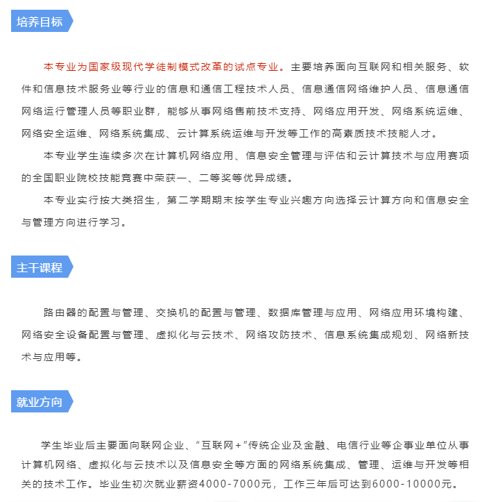 學(xué)院已與思科、星網(wǎng)銳捷、網(wǎng)龍等IT知名企業(yè)建立校企戰(zhàn)略合作,通過(guò)獲得國(guó)際職業(yè)技能證書(shū),提高學(xué)生的學(xué)習(xí)興趣,提升其專業(yè)技能和就業(yè)競(jìng)爭(zhēng)力。畢業(yè)生就業(yè)競(jìng)爭(zhēng)力、就業(yè)率、薪資水平和就業(yè)穩(wěn)定度均居省內(nèi)院校前列。