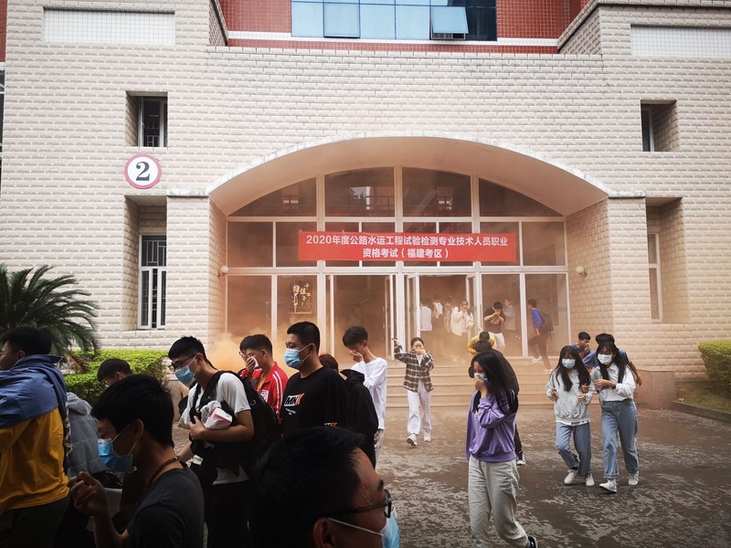 12時(shí)30分,逃生演練在北區(qū)學(xué)生宿舍6號樓及北區(qū)2號、8號教學(xué)樓拉開序幕,為真實(shí)模擬演習(xí)場景,工作人員在各樓前點(diǎn)燃煙霧彈,900多名師生由工作人員帶領(lǐng)彎腰,捂口掩鼻,沿著指定的逃生通道和樓梯口快速撤離到“安全地帶”北區(qū)籃球場。