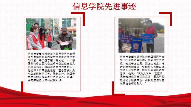 本次“開學第一課”還宣傳并表彰了我院學子在寒假期間積極參加抗疫志愿者的先進事跡。寒假期間,我院積極組織動員青年學生們在家鄉(xiāng)所在地就近就便開展個人寒假社會實踐活動,引導青年學生深入基層一線,在服務國家、服務社會中受教育、長本領、做貢獻。會上對他們的貢獻表示肯定,同時號召全院同學以他們?yōu)榘駱?,向他們學習。