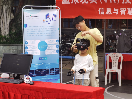 小朋友在志愿者細(xì)心的指導(dǎo)下正確佩戴VR眼鏡