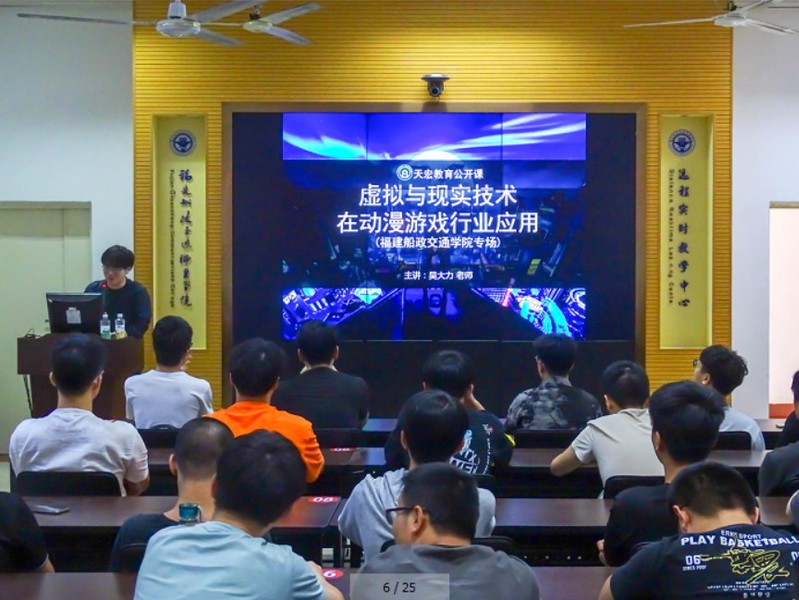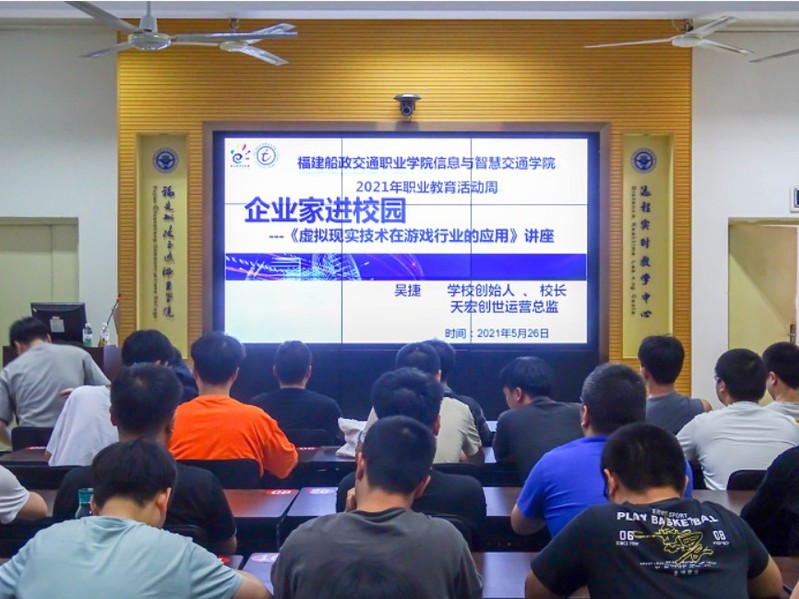 講座由福州天宏創(chuàng)世文化傳播股份有限公司運營總監(jiān)吳捷分別從行業(yè)動態(tài)分析、行業(yè)數(shù)據(jù)分享、行業(yè)技術要求、技術案例分享等方面為我院學子做了以“虛擬現(xiàn)實應用技術在游戲行業(yè)的應用”為主題的分享。