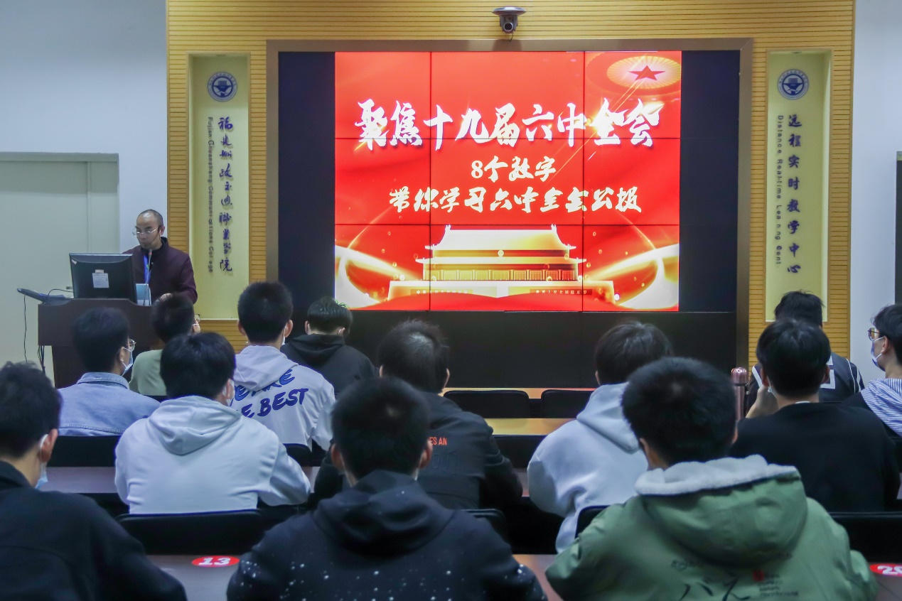 信息與智慧交通學(xué)院黨總支書(shū)記許友孝分別圍繞六中全會(huì)中2個(gè)“確立”、3個(gè)“需要”、4個(gè)“時(shí)期”、4個(gè)“任務(wù)”、5大歷史意義……八個(gè)數(shù)字帶我們學(xué)習(xí)十九屆六中全會(huì)。
