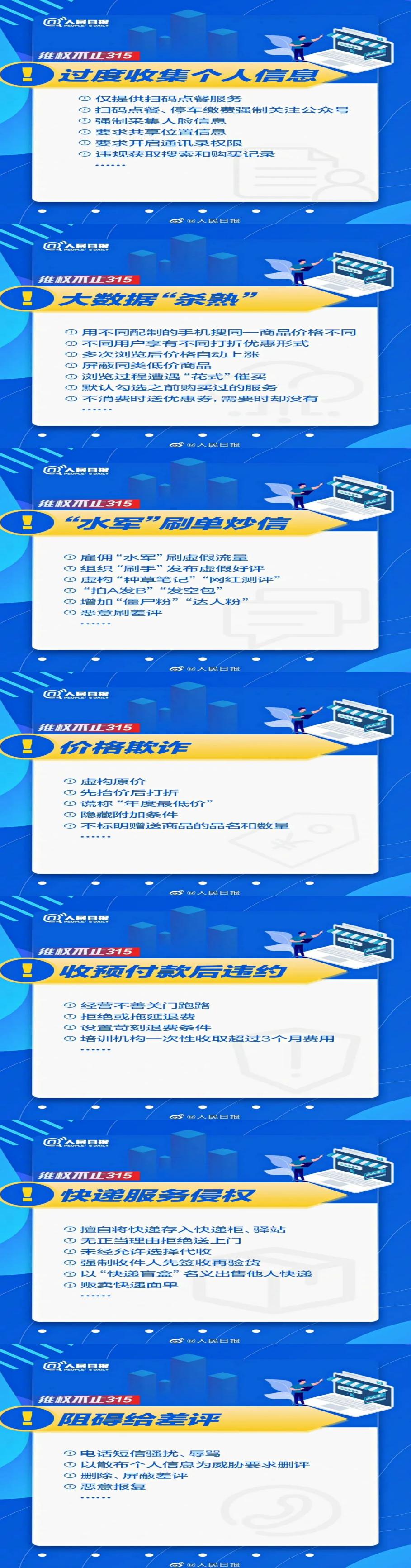 強(qiáng)制掃碼點(diǎn)餐還必須關(guān)注公眾號(hào),要求開啟通訊錄權(quán)限,新老用戶優(yōu)惠不同,培訓(xùn)機(jī)構(gòu)一次性收取超3個(gè)月費(fèi)用,擅自將快遞存入快遞柜……這些商家或平臺(tái)的行為,都是侵害消費(fèi)者權(quán)益!
