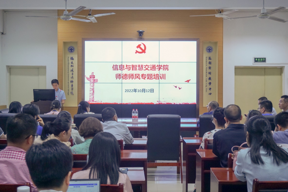 十年樹木百年樹人,教育為重,德育為先,這是師德建設(shè)重要性的深刻體現(xiàn)。教師是立校之本,師德是教育之魂。為進(jìn)一步推進(jìn)我院師德師風(fēng)建設(shè)工作,打造作風(fēng)過硬、師德高尚的教師隊(duì)伍,樹立嚴(yán)格自律、愛崗敬業(yè)、為人師表的良好教師形象。10月12日,信息與智慧交通學(xué)院組織學(xué)院全體教職工于福道園自強(qiáng)樓2-1開展師德師風(fēng)專題培訓(xùn)。此次培訓(xùn)由信息與智慧交通學(xué)院黨總支書記許友孝主持。