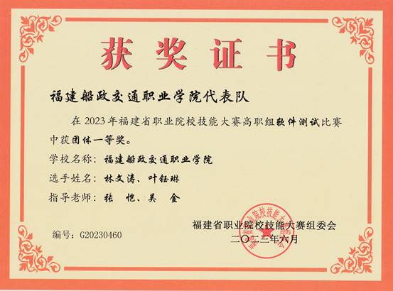 2023年3月11日,福建省職業(yè)院校技能大賽(軟件測(cè)試賽項(xiàng))圓滿落幕,我院的林文濤和葉鈺琳兩位同學(xué)在張愷和吳金兩位老師指導(dǎo)下取得一等獎(jiǎng)第一名。
