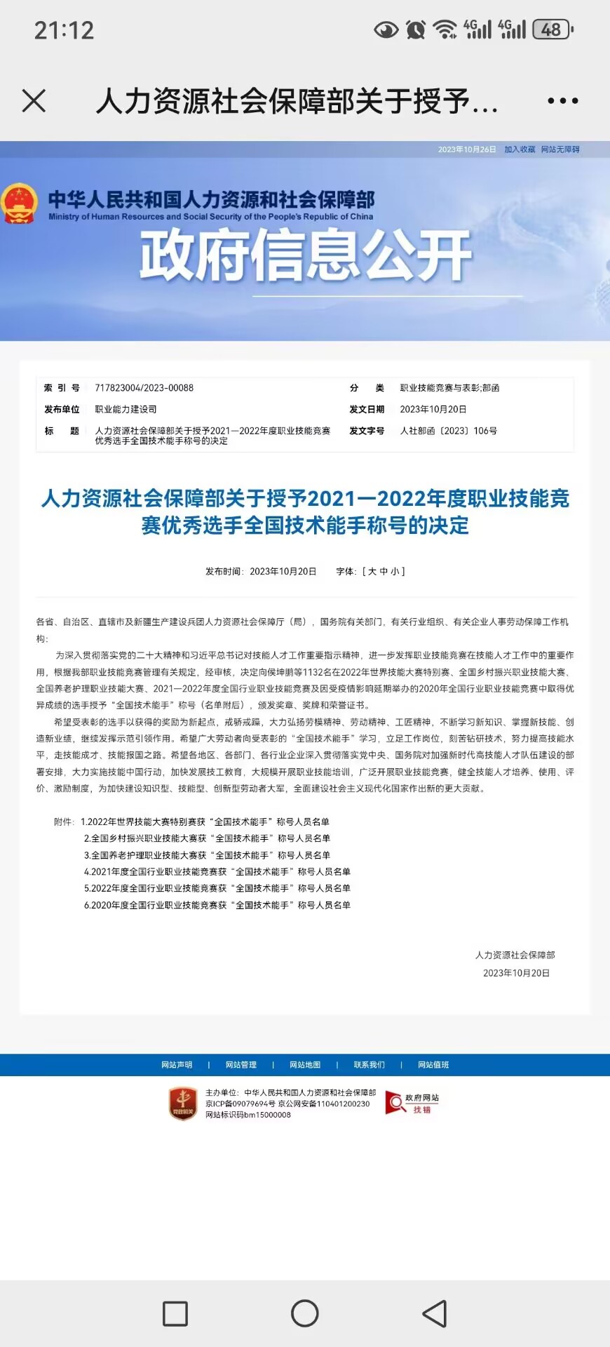 近日,中華人民共和國人力資源社會(huì)保障部發(fā)布通知,人力資源社會(huì)保障部關(guān)于授予2021-2022年度職業(yè)技能競賽優(yōu)秀選手全國技術(shù)能手稱號,我院信息與智慧交通學(xué)院教師王霞獲此殊榮。