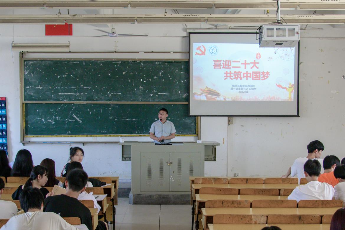 信息與智慧交通學(xué)院第一黨支部書(shū)記白鋒橋以《喜迎二十大 共筑中國(guó)夢(mèng)》為主題,圍繞“開(kāi)展背景及時(shí)間相關(guān)概念綜述”、“政治工作的總體要求”、“政治工作的學(xué)習(xí)教育內(nèi)容”、“政治工作的主要措施”、“政治工作的組織領(lǐng)導(dǎo)”五個(gè)方面展開(kāi)。