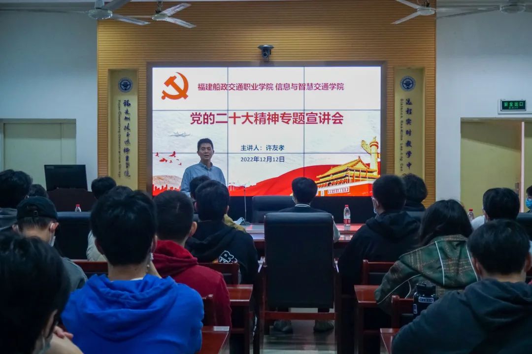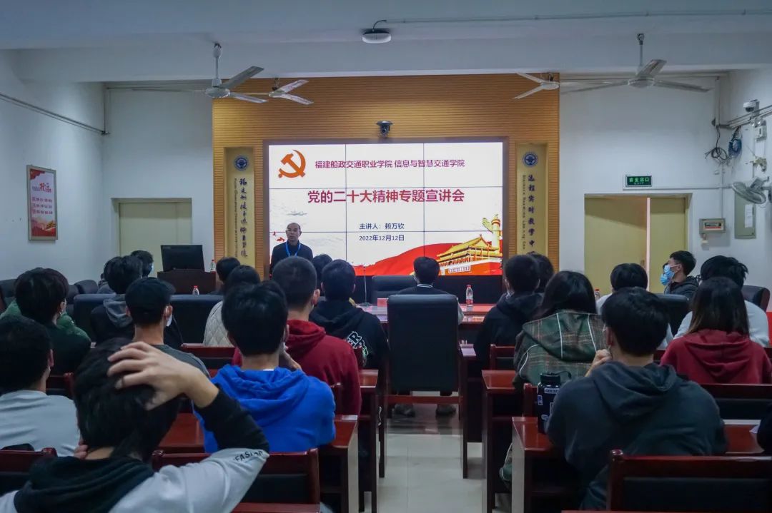 為進(jìn)一步深入學(xué)習(xí)貫徹黨的二十大精神,持續(xù)掀起全院師生學(xué)習(xí)貫徹黨的二十大精神的熱潮,推動(dòng)黨的二十大精神入腦入心、走深走實(shí),信息與智慧交通學(xué)院于12月12日在福道園自強(qiáng)樓2-1教室召開學(xué)習(xí)黨的二十大精神專題宣講會。專題宣講會分別由學(xué)院黨總支書記許友孝、院長賴萬欽主講,全體輔導(dǎo)員和21、22級各班長、團(tuán)支書、入黨積極分子參加了本次宣講會。